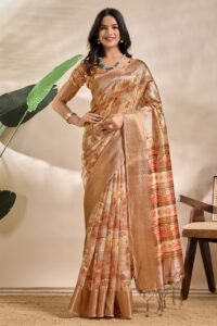 A perfect fusion of tradition and artistry, this soft silk blend saree showcases charming tribal-style elephant motifs across a soft beige base. The design evokes heritage elegance, complemented by a warm palette of earthy tones and a rich zari woven border.