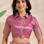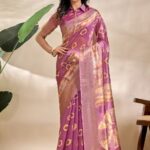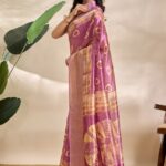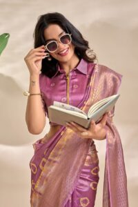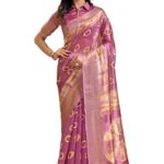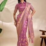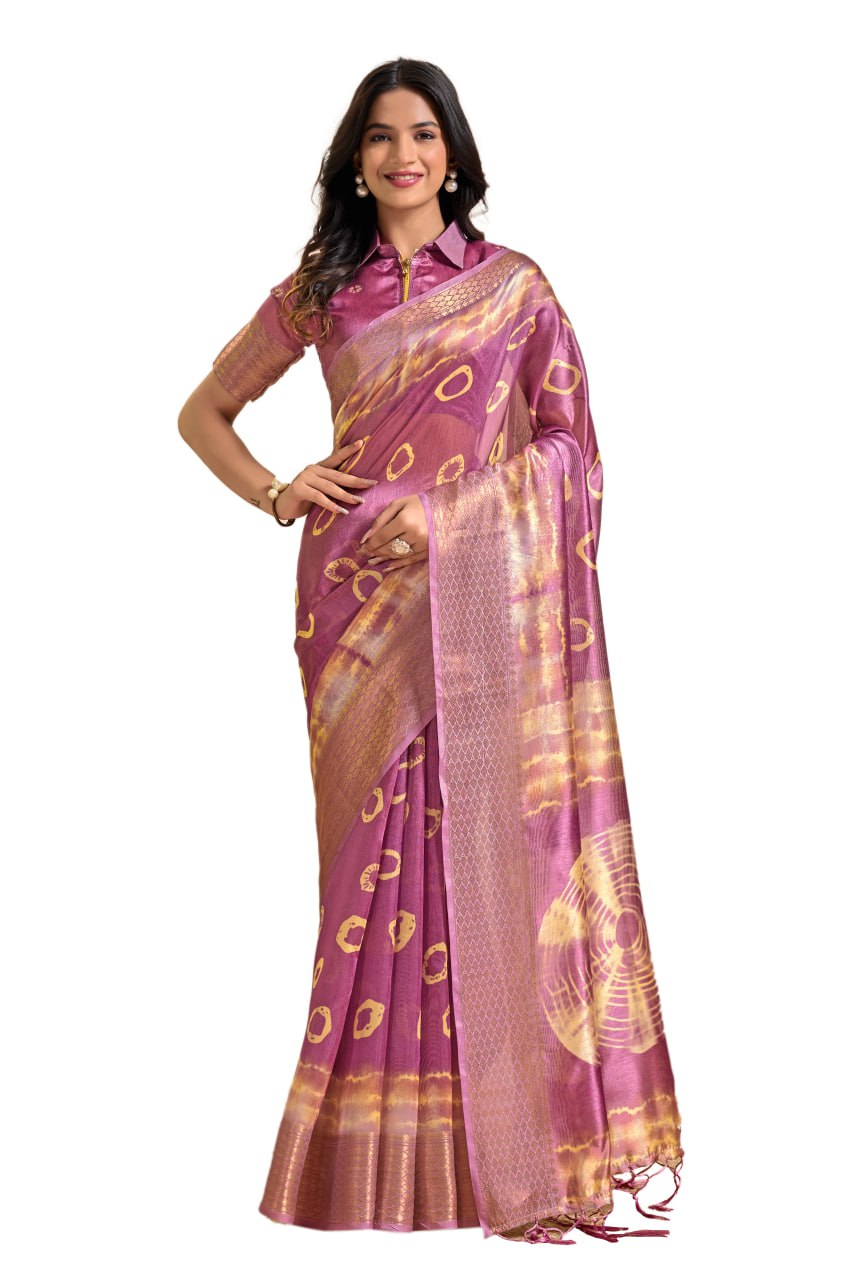 Exuding timeless charm, this mauve soft silk blend saree features intricate tie-dye patterns in golden tones, giving it an artisanal appeal. The delicate zari woven border adds a regal touch, making it perfect for both festive and traditional occasions.
